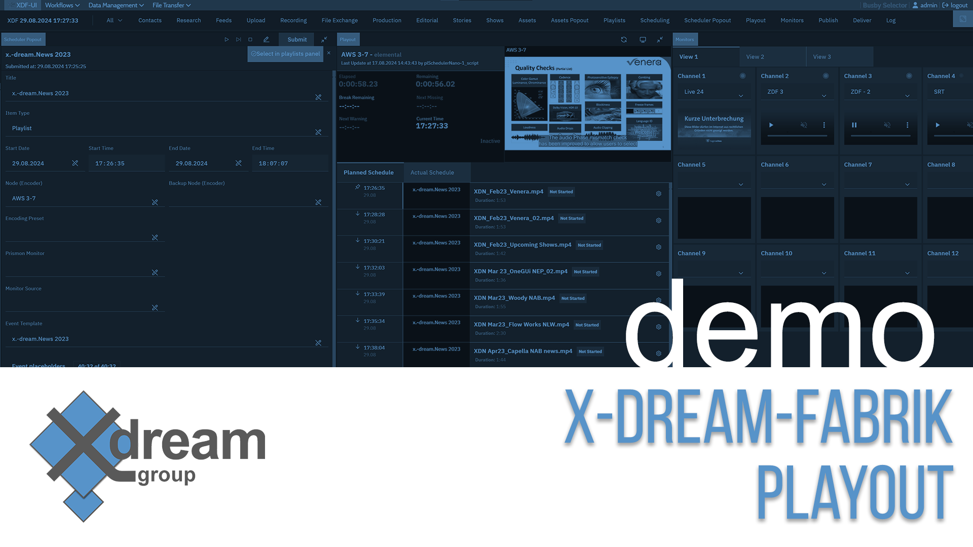 PLAYOUT consists from the x-dream-Fabrik modules Upload, Archive, Schedule, Playout and Monitor. It can be combined with all source modules like Record, Ingest, File Exchange, with the post-production product PRODUCE, with the media management product ARCHIVE, and with the output products like PUBLISH and DELIVER.