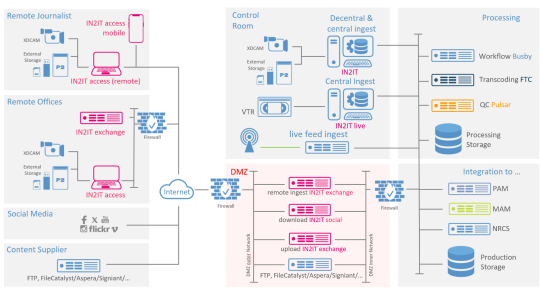 For customers with distributed organisations, the IMS can be deployed at every facility and connected to act as one global system via a bridging module. In larger installations the IMS is part of the all over Production Management System (PMS) that orchestrates and integrates all the facilities building blocks and teams to become one efficient end2end business process. A PMS adds asset aggregation to the solution prior to handing the content to editing, archiving, news operations, playout and publishing.