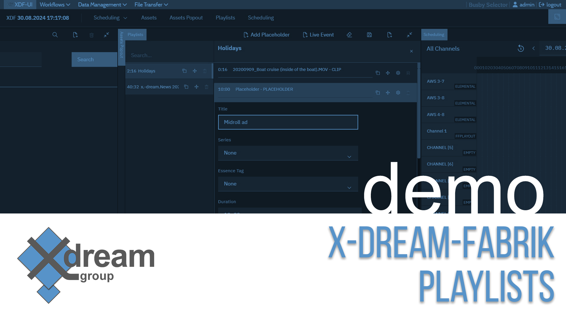 PLAYOUT consists from the x-dream-Fabrik modules Upload, Archive, Schedule, Playout and Monitor. It can be combined with all source modules like Record, Ingest, File Exchange, with the post-production product PRODUCE, with the media management product ARCHIVE, and with the output products like PUBLISH and DELIVER.
